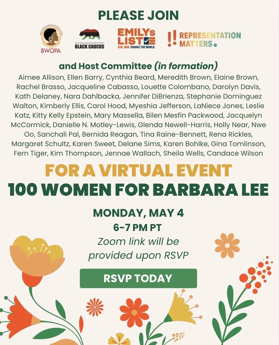 2. Invitation for 100 Women for Barbara Lee kick off, a national virtual event with the Mayor and special guests on Monday, March 30th, at 5 PM PT / 8 PM ET. Your name will be listed on the Host Committee.